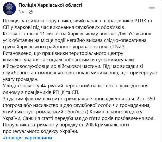 У ході конфлікту 44-річний перехожий наніс тілесні ушкодження одному з працівників РТЦК та СП", - йдеться у повідомленні.
