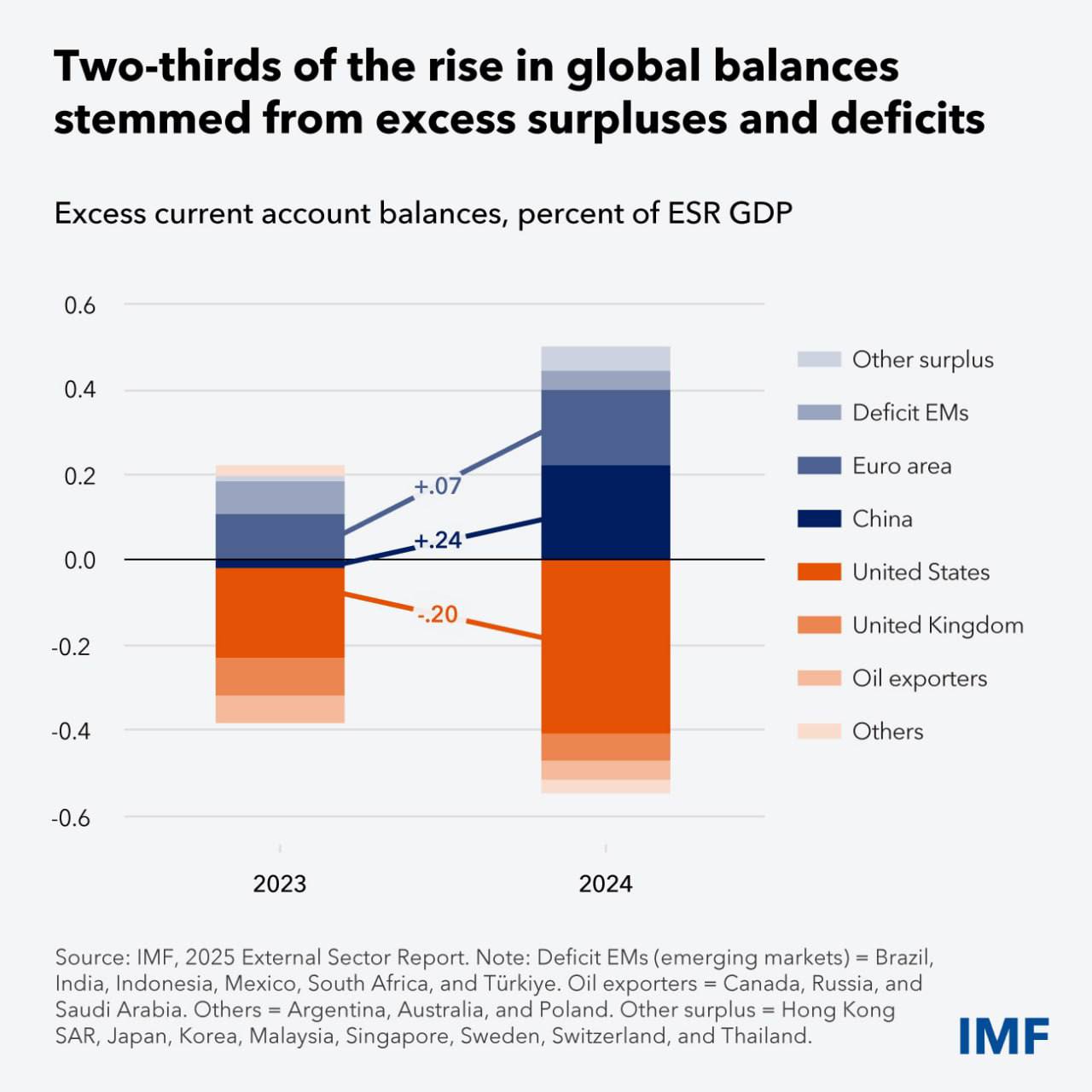 "Зростання надлишкового сальдо є найзначнішим за десятиліття і зумовлене насамперед Китаєм (+0,24% світового ВВП), США (-0,20%) і, меншою мірою, єврозоною (+0,07%)", - зазначає Гурінша.