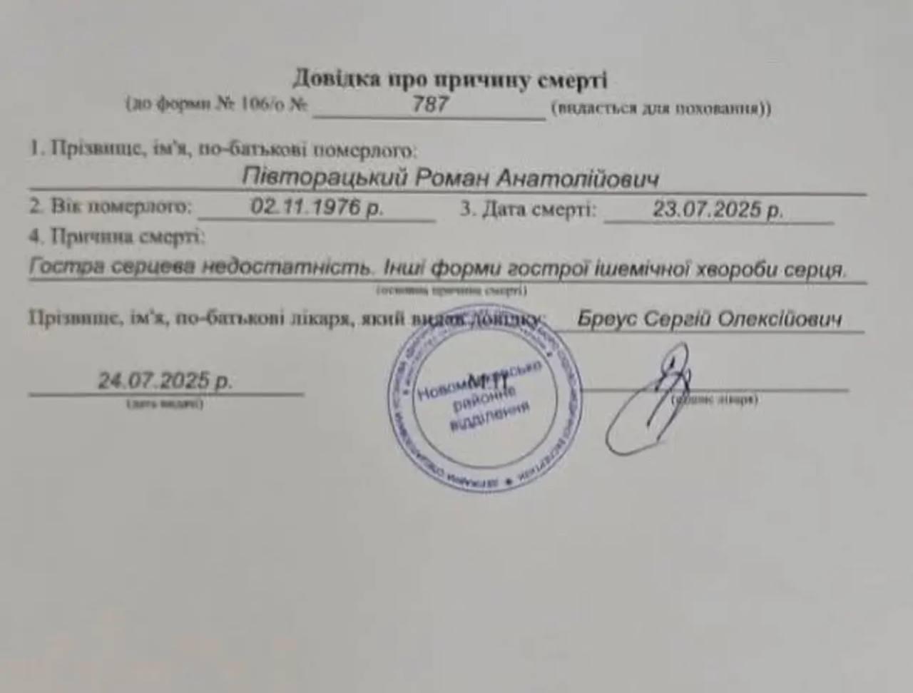 Дочка 52-річного Романа Півторацького повідомляє, що після мобілізації біля під'їзду до Запоріжжя його повезли до навчального центру. Протягом тижня рідним у частині відповідали, що з ним "все гаразд" і він зателефонує пізніше. Але за тиждень сім'ї повідомили про смерть, яка настала вже через добу після мобілізації.