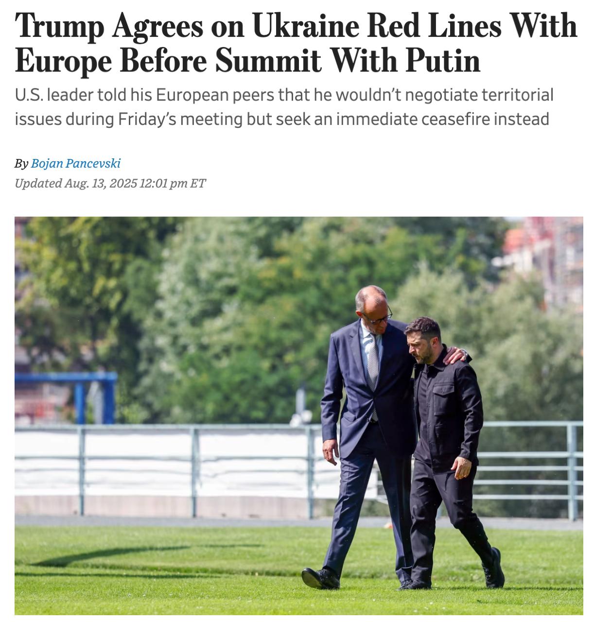 "Європейські чиновники спочатку прагнули отримати пряме представництво на зустрічі на Алясці, в якій також візьмуть участь держсекретар США Марко Рубіо і міністр закордонних справ Росії Сергій Лавров, запропонувавши генсека НАТО Марко Рютте або іншого європейського лідера, а також Володимира Зеленського. Але після телефонних розмов між канцлером ФРН Фрідріхом Мерцем та Дональдом Трампом європейці відмовилися від цієї вимоги", - додає газета.