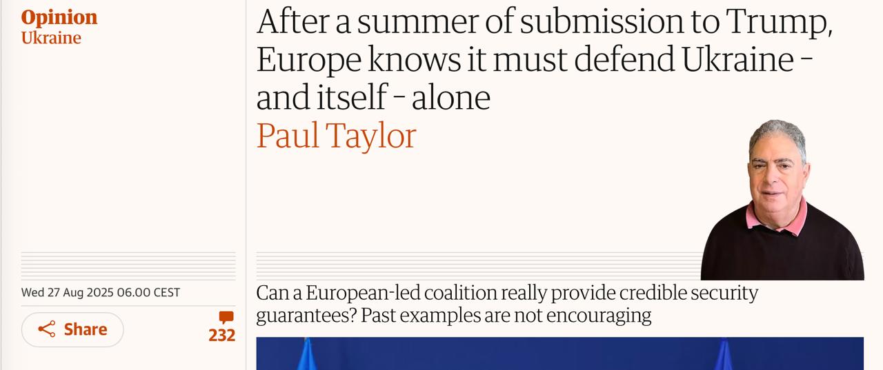 Також, як пише в колонці для газети The Guardian Пол Тейлор - старший запрошений науковий співробітник Європейського політичного центру, Європа поки що не спроможна відправити свої війська в Україну, але й умов для цього немає.