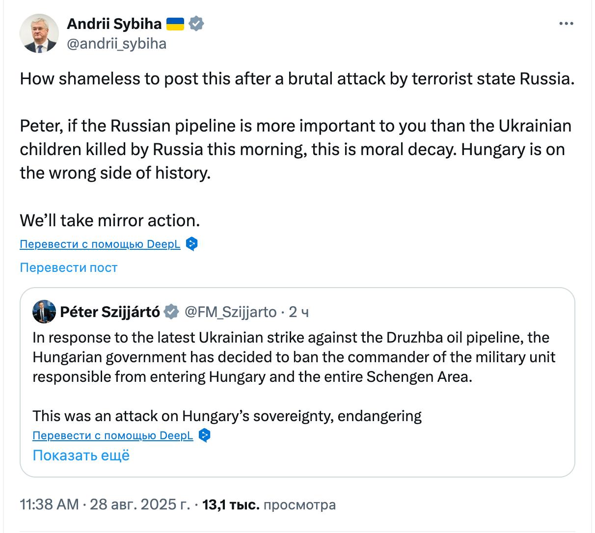 "Як безсоромно публікувати це після жорстокої атаки терористичної держави Росія. Пітер, якщо російський трубопровід для тебе важливіший, ніж українські діти, вбиті Росією цього ранку, це моральне розкладання. Угорщина перебуває на неправильному боці історії", - написав Сибіга, відповівши на пост угорського колеги.