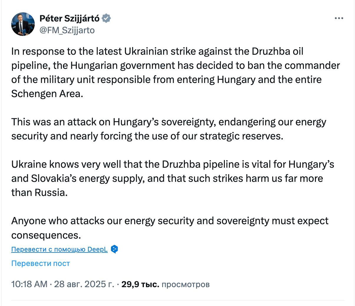 "Це було зазіхання на суверенітет Угорщини, яке поставило під загрозу нашу енергетичну безпеку і мало не змусило нас задіяти стратегічні запаси", - пише Сійярто.