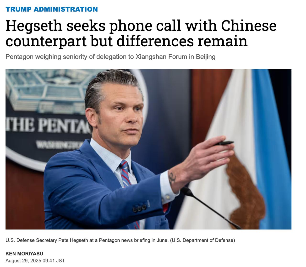 За їхніми даними, Китай вагається, оскільки "не бачить чіткого шляху до покращення відносин". Зокрема, Пекін звернув увагу на заяву глави Пентагону Піта Хегсета, що "загроза з боку Китаю є реальною, і вона може бути неминучою".