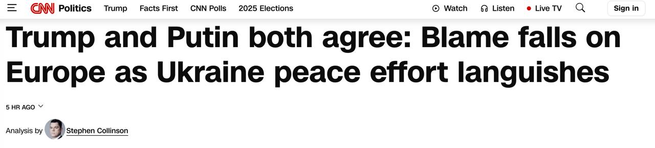 Президенти США Дональд Трамп та Росії Володимир Путін згодні на те, що на Європі лежить вина за те, що мирні зусилля в Україні зайшли в глухий кут.