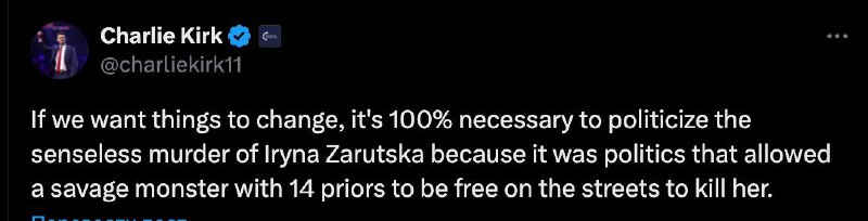 "Якщо ми хочемо змін, то на 100% необхідно політизувати безглузде вбивство Ірини Заруцької, тому що саме політика дозволила дикому монстру з 14 попередніми злочинами залишатися на волі і вийти на вулицю, щоб убити її", - написав Кирк, маючи на увазі. злочини. Трампісти називають подібну практику наслідком м'якої політики Демократичної партії щодо злочинності.
