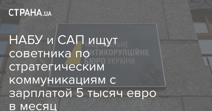 Національне антикорупційне бюро України та Спеціалізована антикорупційна прокуратура оголосили про пошук спеціаліста на посаду старшого радника зі стратегічних комунікацій. Відомства обіцяють зарплату у розмірі п'яти тисяч євро на місяць.