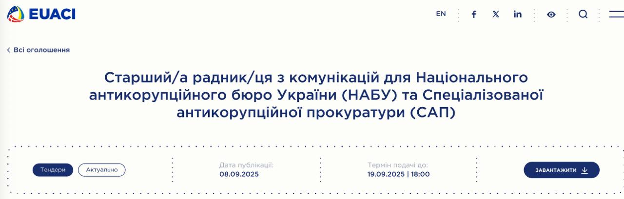 Вакансія розміщена на сайті EUACI – антикорупційної ініціативи Євросоюзу в Україні.