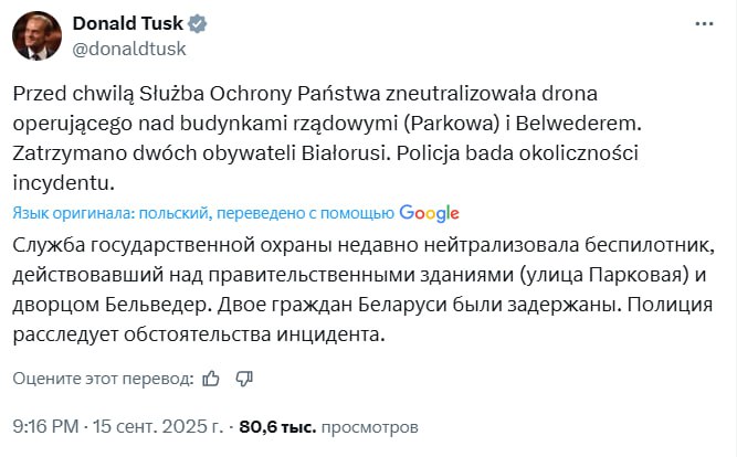 "Служба державної охорони нейтралізувала безпілотник, який літав над урядовими будівлями (вулиця Паркова) та палацом Бельведер", - написав Туск.
