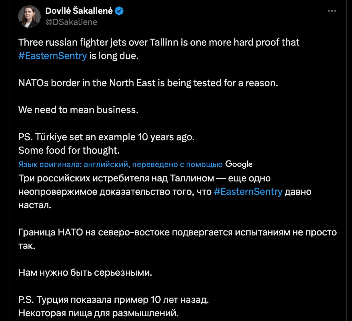 "Три російські винищувачі над Таллінном - ще один твердий доказ того, що "Східний страж" (ініціатива НАТО після зальоту російських дронів у Польщу - Ред. ) давно назрів. Північно-східний кордон НАТО перевіряється не просто так. Ми повинні діяти серйозно. Туреччина показала приклад 10 років тому. Є над чим замислитись", - написала міністр.