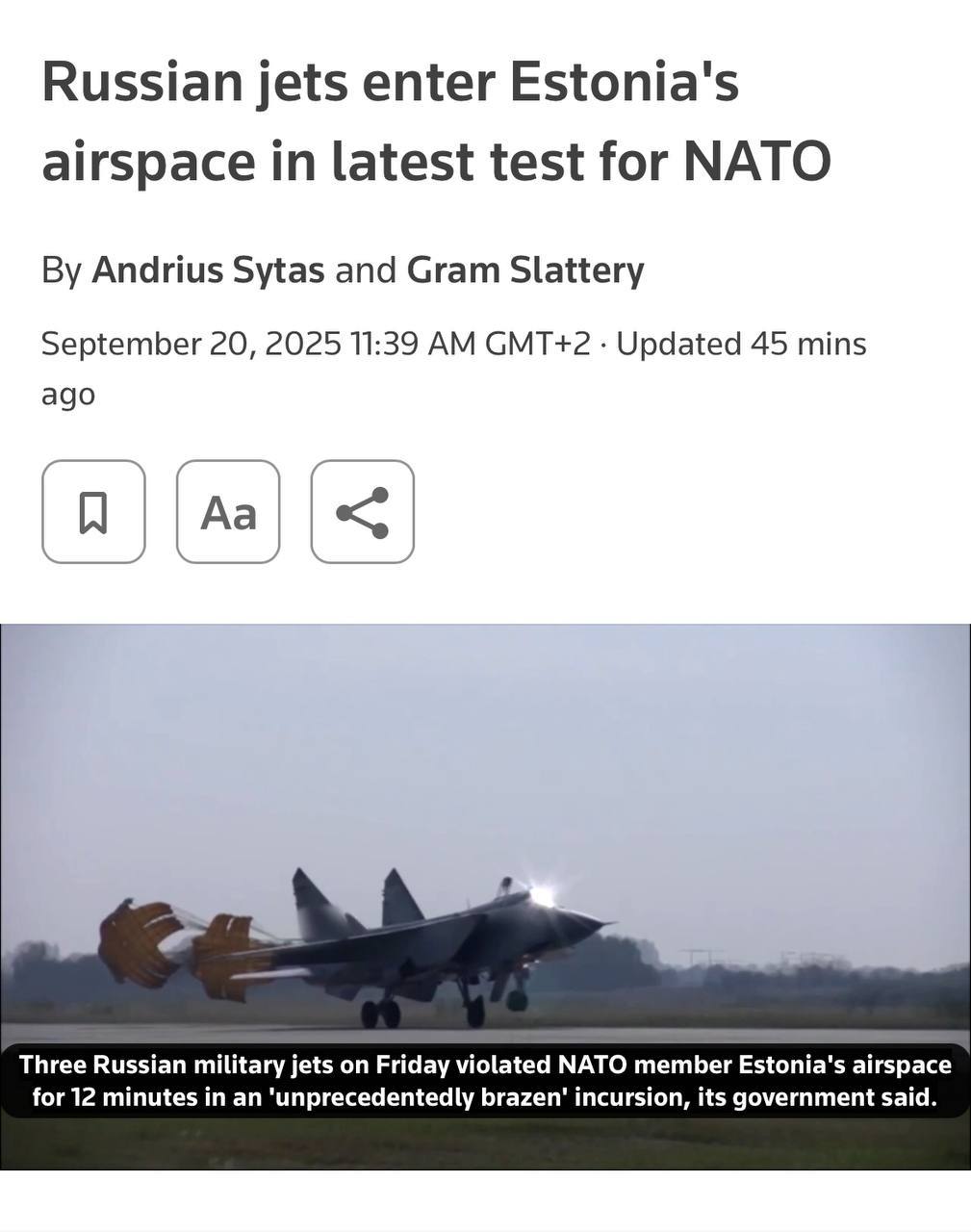 Тим часом анонімний американський чиновник, думку якого наводить агентство Reuters, вважає, що вторгнення російських літаків у повітряний простір Естонії було навмисним.