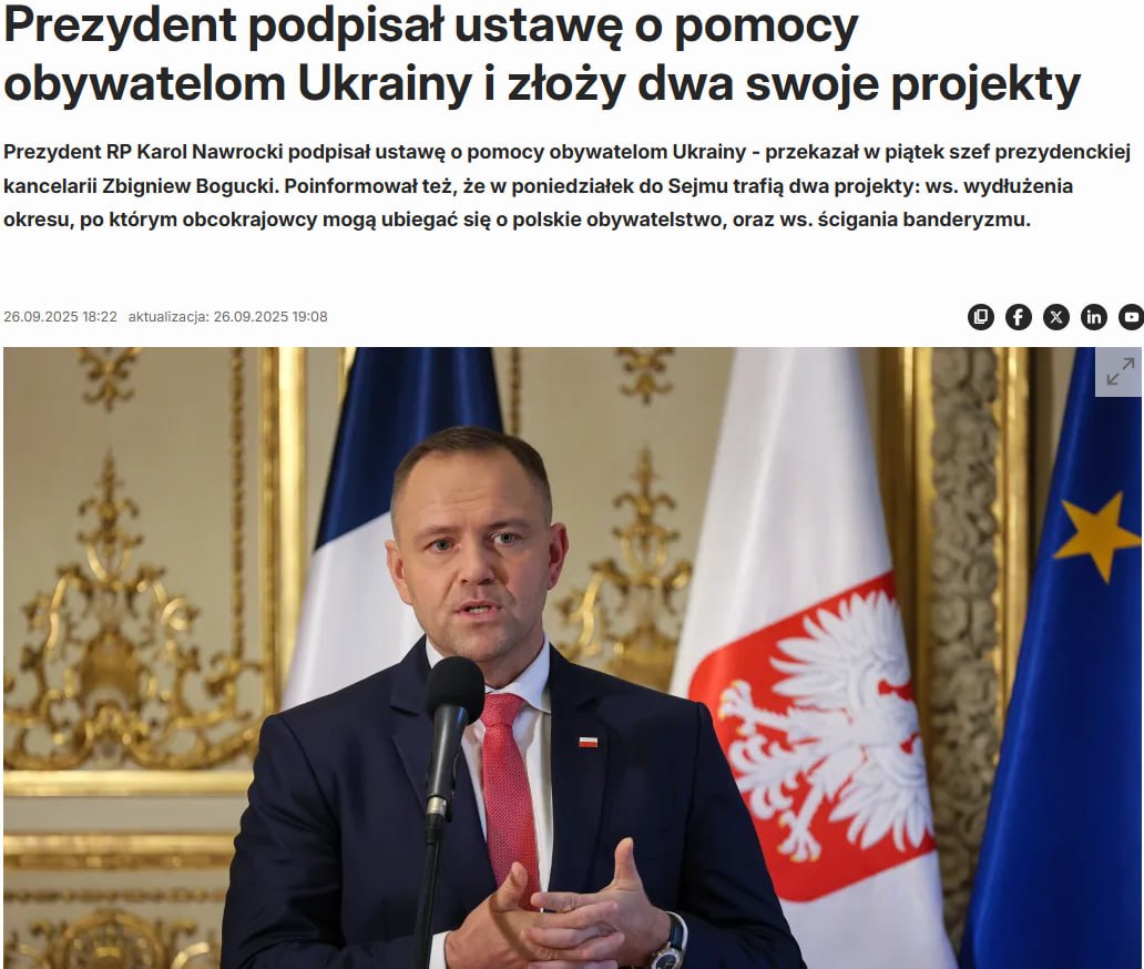 "Це останній законопроект, підписаний президентом у рамках цієї формули допомоги, спеціальної допомоги, тому що сьогодні немає жодних підстав і причин продовжувати подібні дії. Президент не підпише жодного іншого законопроекту з цього питання. Ми повинні перейти до нормальних умов, тобто ставитися до громадян України, які проживають на території Республіки Польща, так само, як і до всіх інших".