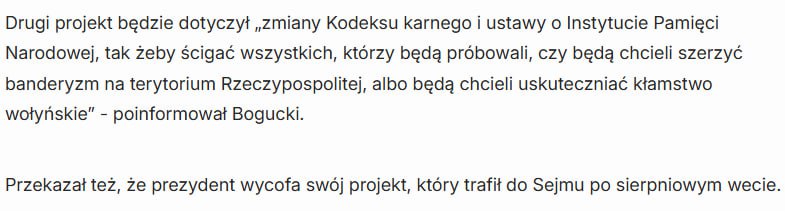 Проект стосуватиметься "внесення змін до Кримінального кодексу та Закону про Інститут національної пам'яті, щоб притягнути до відповідальності всіх тих, хто намагається чи хоче поширювати бандерівщину на території Республіки Польща або хоче увічнити брехню про Волинську різанину", – сказав Богуцький.