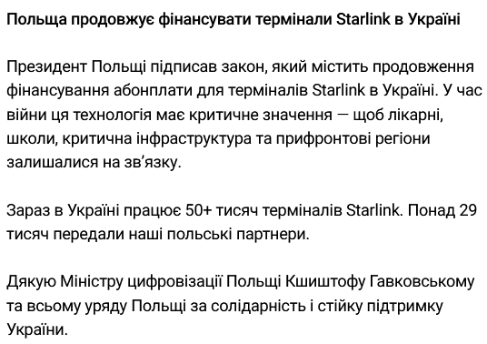 "Президент Польщі Кароль Навроцький підписав закон, що містить продовження фінансування абонплати для терміналів Starlink в Україні. Під час війни ця розробка має критичне значення. Наразі в Україні працюють 50 тисяч терміналів Starlink. Понад 29 тисяч передали наші польські партнери", – написав Федоров.