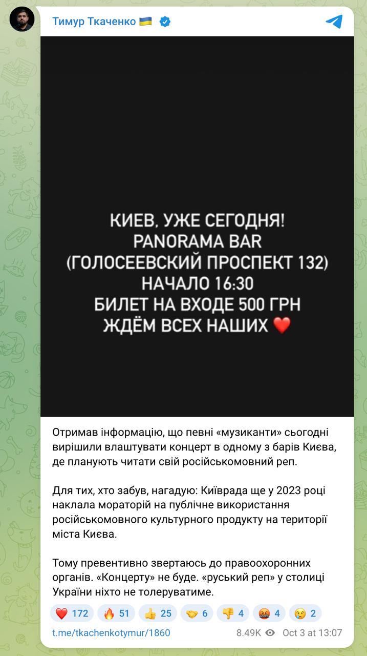 "Для забутих нагадую: Київрада ще у 2023 році наклала мораторій на публічне використання російськомовного культурного продукту на території міста Києва. Тому превентивно звертаюся до правоохоронних органів. Концерту не буде. Російський реп у столиці України ніхто не терпітиме", - написав Ткаченко.