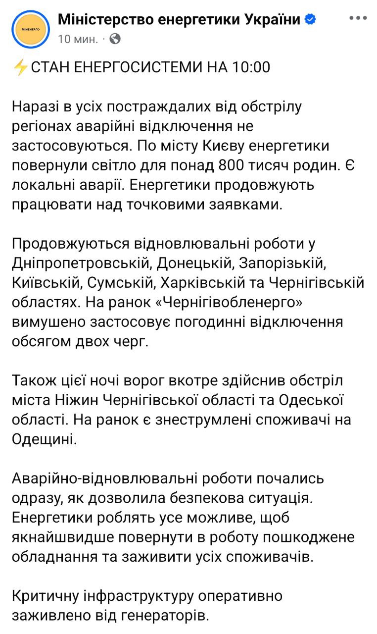 10:50 Після вчорашнього обстрілу графіки аварійних відключень світла діють лише на Чернігівщині.