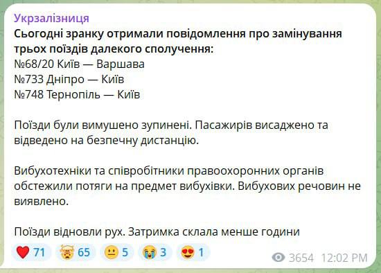 13:23 Сьогодні вранці до Укрзалізниці надійшло повідомлення про замінування трьох поїздів.