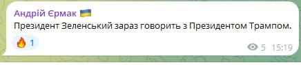 15:20 Зеленський зараз розмовляє з Трампом, пише Єрмак.