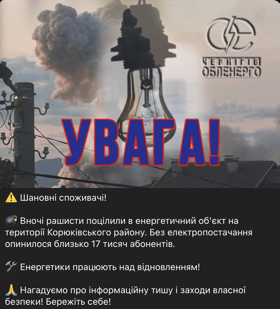 "Вночі росіяни потрапили в енергетичний об'єкт на території Корюківського району. Без електропостачання виявилося близько 17 тисяч абонентів", - йдеться у повідомленні.
