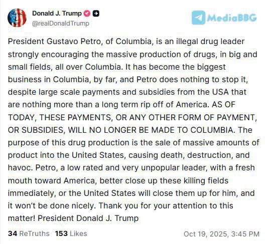 "Президент Густаво Петро з Колумбії є лідером незаконного обігу наркотиків і активно заохочує масове виробництво наркотиків на великих і малих плантаціях по всій країні. Це стало найбільшим бізнесом в Колумбії, і Петро не вживає жодних заходів для його зупинки, незважаючи на великі виплати і субсидії з боку США, які насправді є довгостроковою "обманною схемою" для Америки. Відтепер ці виплати чи будь-які інші форми фінансової допомоги, субсидій більше не надаватимуться Колумбії", - написав Трамп.