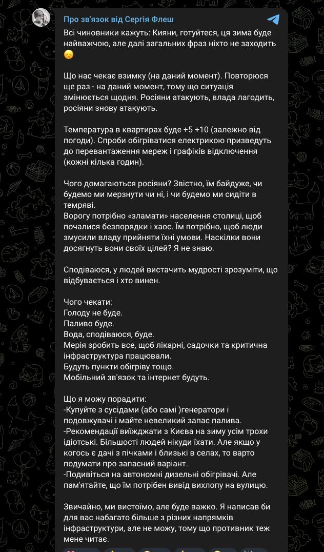 "Якщо у когось є дачі з грубками та близькі у селах, то варто подумати про запасний варіант", - заявив "Флеш". Він також радить киянам купувати складщину з сусідами генератори та запасатися паливом.