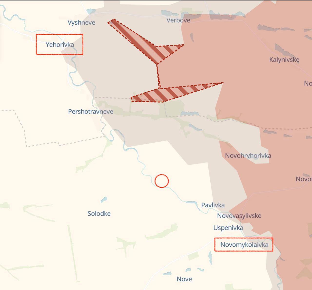 Також від Єгорівки залишається трохи більше чотирьох кілометрів до траси з Покровського на Гуляйполі, яка схоже переходить під щільний вогневий контроль РФ.