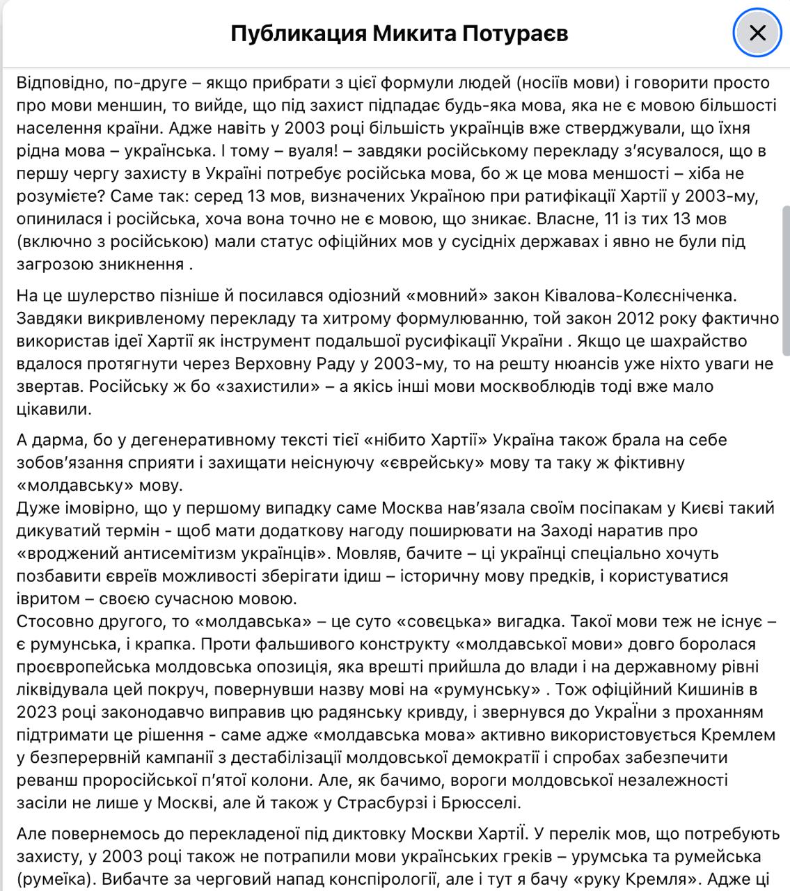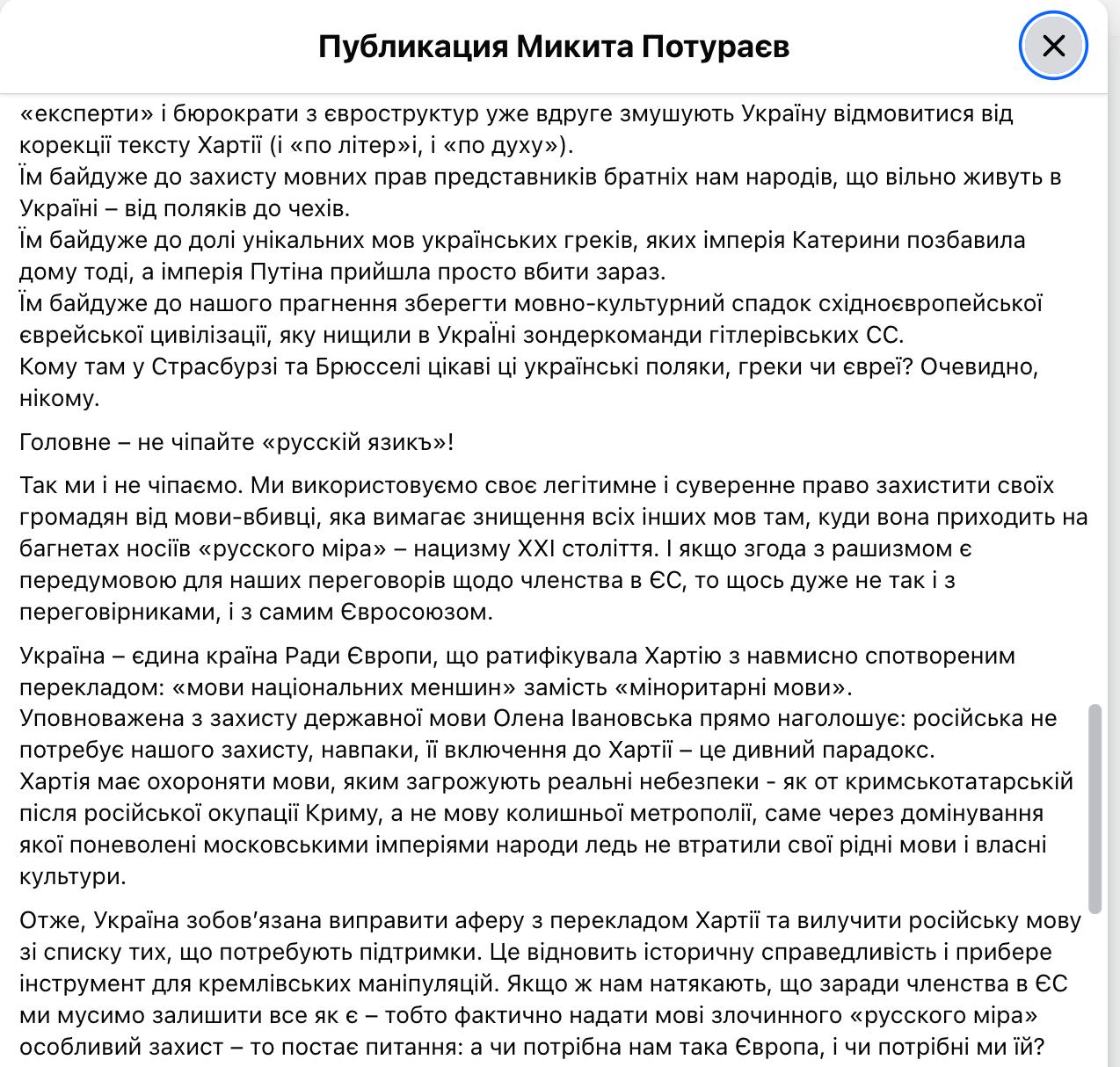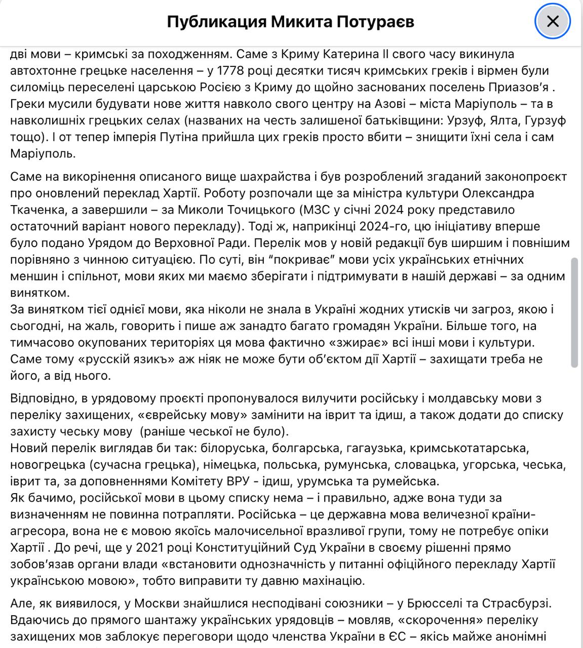 Народний депутат і голова комітету Верховної Ради з гуманітарної та інформаційної політики Микита Потураєв підтвердив інформацію про те, що зняти з розгляду парламенту законопроект про позбавлення російської захисту Європейської хартії регіональних або міноритарних мов змусили європейці.