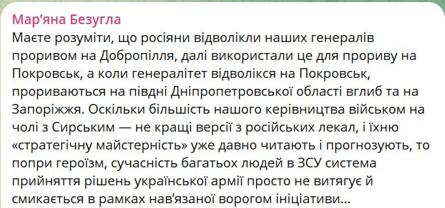 "Маємо розуміти, що росіяни відвернули наших генералів проривом на Добропілля, далі використовували це для прориву на Покровськ, а коли генералітет відволікся на Покровськ, прориваються на півдні Дніпропетровської області вглиб і Запоріжжя. Оскільки більшість нашого керівництва військом на чолі з Сирським - не найкращі версії за " читають та прогнозують, то, незважаючи на героїзм, сучасність багатьох людей у ЗСУ система ухвалення рішень української армії просто не витягує і смикається в рамках нав'язаної ворогом ініціативи", – написала вона.
