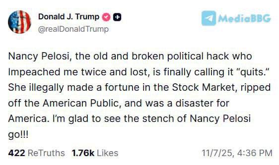 "Ненсі Пелосі, стара і зношена політична аферистка, яка двічі намагалася оголосити мені імпічмент і програла, нарешті йде у відставку. Вона незаконно заробила стан на фондовому ринку, обдурила американську громадськість і була катастрофою для Америки. Радий бачити, як зникає сморід Ненсі Пелосі!" – написав Трамп у мережі Х.