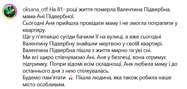 Заявляється, що Валентина Підвербна померла у своїй квартирі, її тiло виявила 14-річна донька Анна-Марія.