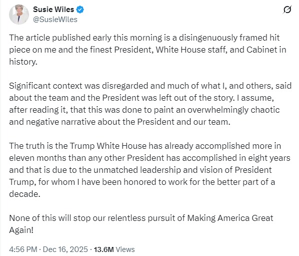 Прес-секретар Білого дому Керолайн Левітт на хвилі скандалу заявила, що Трамп "немає важливішої чи лояльнішої радниці, ніж Сьюзі", а весь уряд "вдячний їй за її розсудливе керівництво" і згуртовано стоїть за неї.
