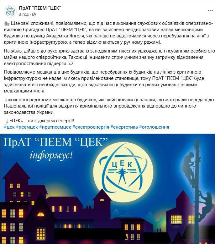 У цих будинках на вулиці Академіка Янгеля раніше завжди було світло, тому що вони знаходяться на одній лінії з критично важливим об'єктом. Тепер їх почали відключати у ручному режимі. що спровокувало бійки з псуванням майна. Через ці бійки не вдається вчасно включати іншу чергу. Справу передано до поліції.