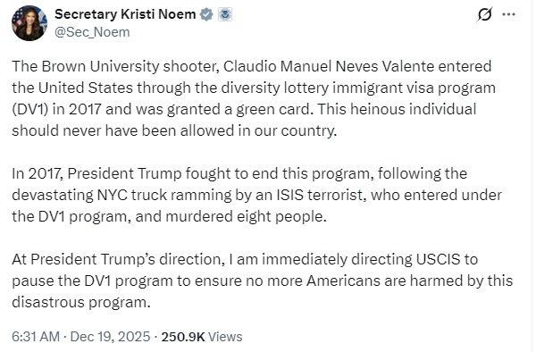"Клаудіо Мануель Невес Валенте, стрілець із Браунівського університету, в'їхав до США у 2017 році за програмою імміграційних віз диверсифікаційної лотереї (DV1) та отримав грін-карту. Цій мерзенній людині ніколи не слід було дозволяти в'їзд до нашої країни.У 2017 році президент Трамп боровся за припинення дії цієї програми після жахливого інциденту в Нью-Йорку, коли терорист ІДІЛ, який в'їхав за програмою DV1, протаранив вантажівкою вісім людей.За вказівкою президента Трампа, я негайно доручаю USCIS призупинити програму DV1, щоб гарантувати, що від цієї катастрофічної програми більше ніхто з американців не постраждає", - сказано в публікації Ноем.