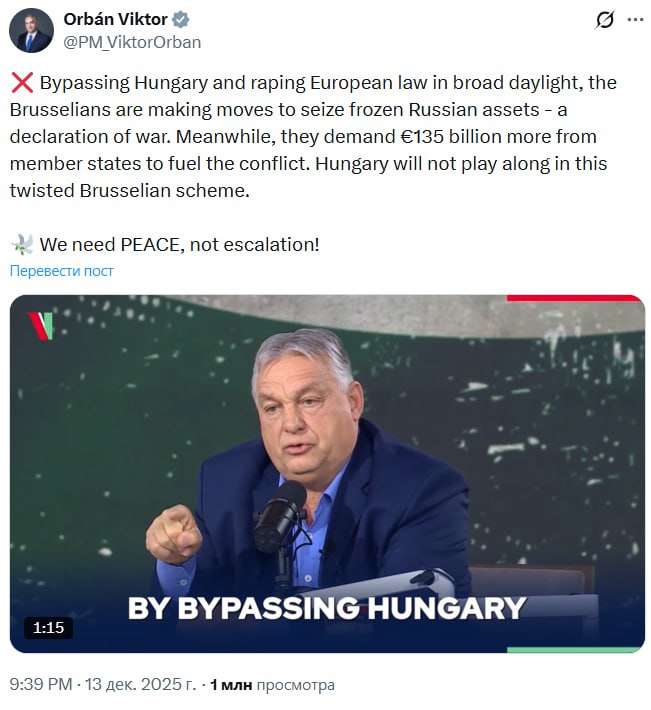 "Минаючи Угорщину і порушуючи європейське законодавство серед білого дня, брюссельці роблять кроки по захопленню заморожених російських активів - це оголошення війни. Тим часом вони вимагають ще 135 мільярдів євро від держав-членів для розпалювання конфлікту. Угорщина не збирається брати участь у цій війні." світ, а не ескалація! – написав Орбан у неділю (ще до провалу ідеї репараційного кредиту).