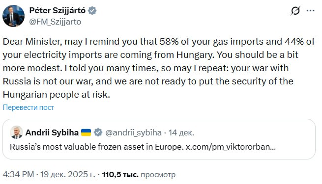 "Дозвольте нагадати вам, що 58% вашого імпорту газу і 44% імпорту електроенергії припадає на Угорщину. Вам слід було б бути трохи скромнішим. Я вже багато разів говорив вам про це, тому дозвольте повторити: ваша війна з Росією – це не наша війна. І ми не готові ставити під загрозу безпеку угорського народу."
