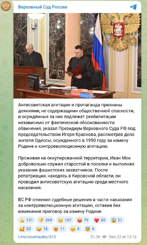 "Антирадянська агітація і пропаганда визнані діяннями, які не містять суспільної небезпеки, і засуджені за них підлягають реабілітації незалежно від фактичної обґрунтованості звинувачення, вказав президія Верховного суду РФ під головуванням Ігоря Краснова, розглянувши справу жителя Одеси, засудженого в 1950 році". - сказано у публікації.