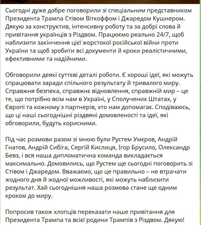 Президент України Володимир Зеленський разом з українською делегацією на мирних переговорах поговорили зі спецпредставниками президента США Дональда Трампа Стівеном Віткоффом та Джаредом Кушнером.