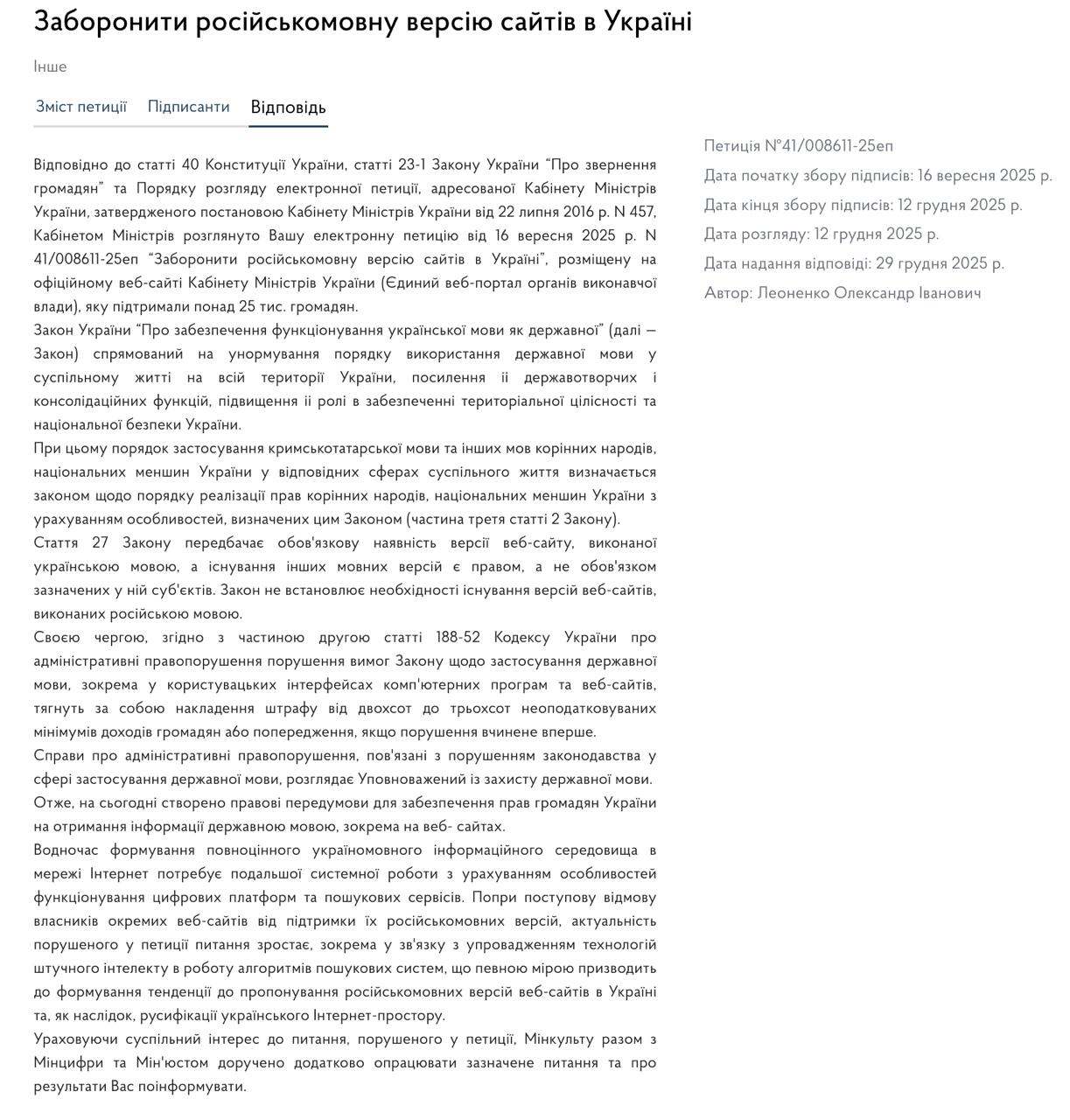 Петиція, що з'явилася 16 вересня, до початку грудня набрала 25 690 голосів з необхідних для відповіді 25 тисяч. Її автор Олександр Леоненко обурювався: "Для кого передбачено російськомовну версію сайтів в Україні? Якщо для росіян, то навіщо ми створюємо сайти для нашого ворога, який прийшов з війною нас вбивати? Якщо для громадян інших країн, то міжнародною мовою є англійська, а не російська".