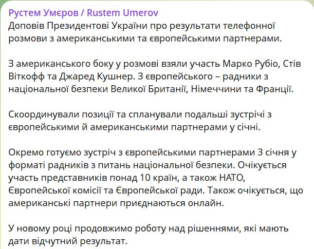 "Скоординували позиції і спланували подальші зустрічі з європейськими та американськими партнерами в січні. Окремо готуємо зустріч з європейськими партнерами 3 січня у форматі радників з національної безпеки. Очікується участь представників понад 10 країн, а також НАТО, Європейської комісії та Європейської ради. Також очікується, що американські партнери підключатимуться онлайн", – написав Умеров.