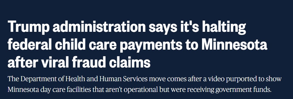 Після резонансу в соцмережах Міністерство охорони здоров'я та соціальних служб США заявило про заморожування всіх федеральних виплат на оплату послуг з догляду за дітьми в штаті Міннесота. NBC News наводить слова заступника міністра Джима О'Ніла та помічника міністра Алекса Адамса про те, що крім призупинення всіх виплат до Міннесоти відомство вводить нові вимоги до виплат за послуги з догляду за дітьми по всій країні. У заяві йдеться, що для всіх платежів, які обробляє підрозділ міністерства Адміністрація у справах дітей та сімей, "вимагатимуть обґрунтування та квитанції або фотодокази".