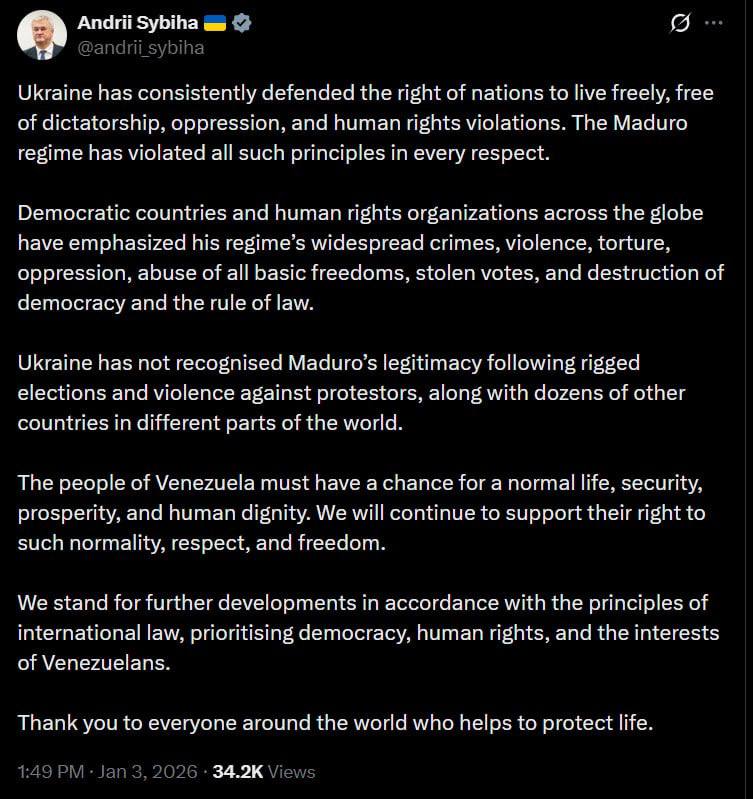"Україна, як і десятки інших країн у різних частинах світу, не визнала легітимність Мадуро після сфальсифікованих виборів і насильства щодо протестувальників. Народ Венесуели повинен мати можливість жити нормальним життям, у безпеці, процвітанні і з людською гідністю. Ми будемо й надалі підтримувати їхнє право на таке.
