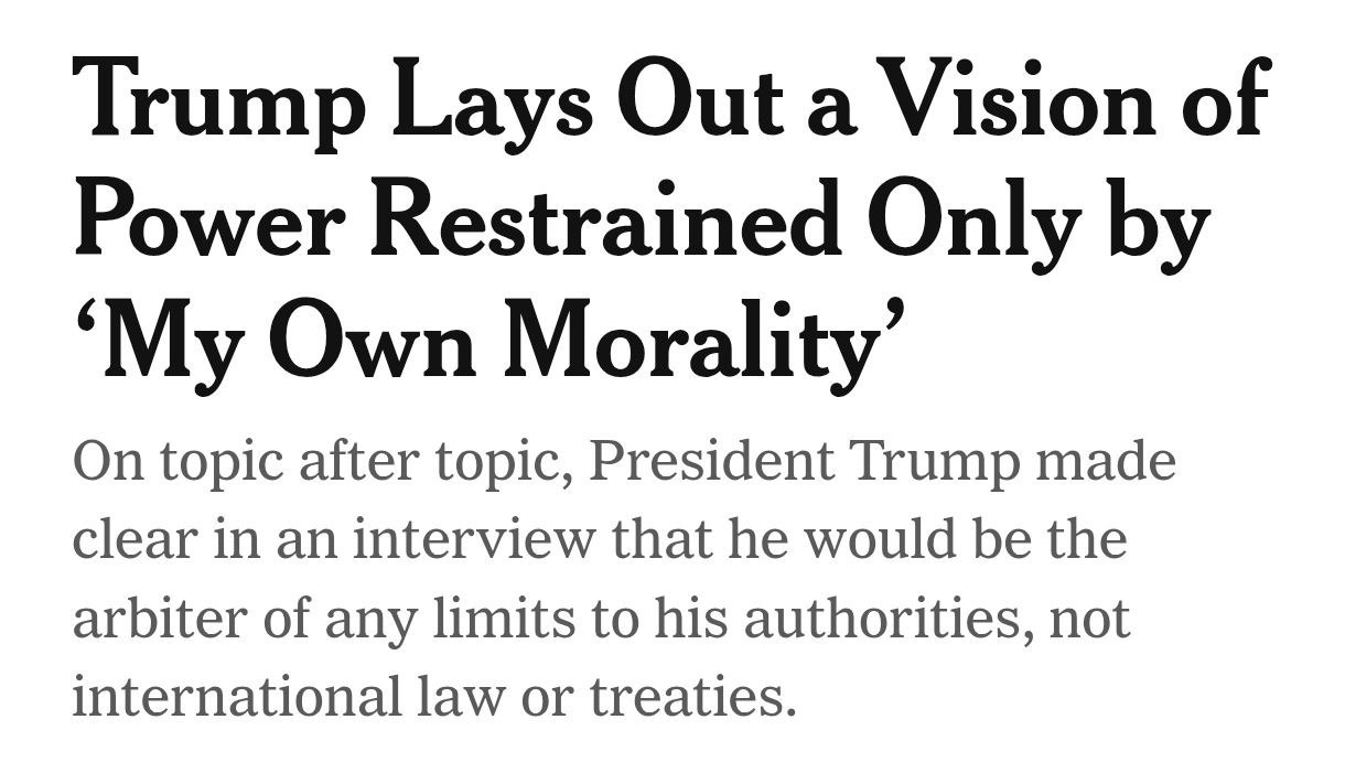 Президент США Дональд Трамп заявив, що як обмеження своїх повноважень він орієнтується тільки на власну мораль, а не на міжнародне право.