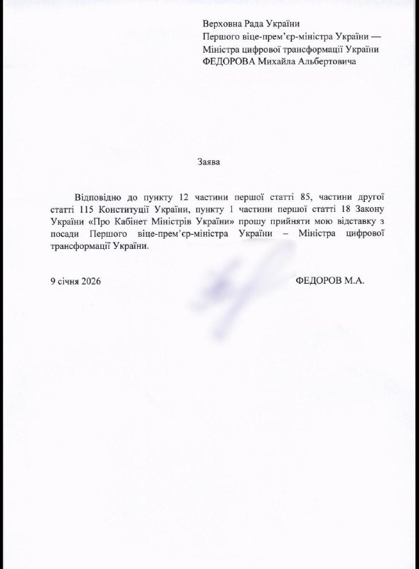 Міністр оборони України Денис Шмигаль та перший віце-прем'єр-міністр та міністр цифрової трансформації Михайло Федоров подали до Верховної Ради заяви про відставку.