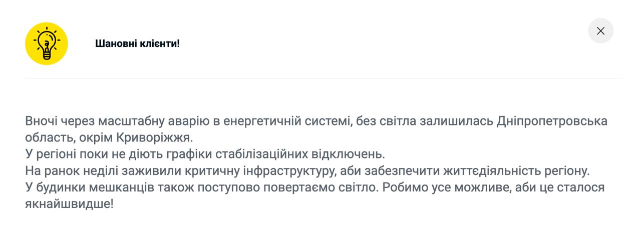 9:58 На Дніпропетровщині вночі сталася аварія в енергосистемі. Графіки вимкнень не діють.
