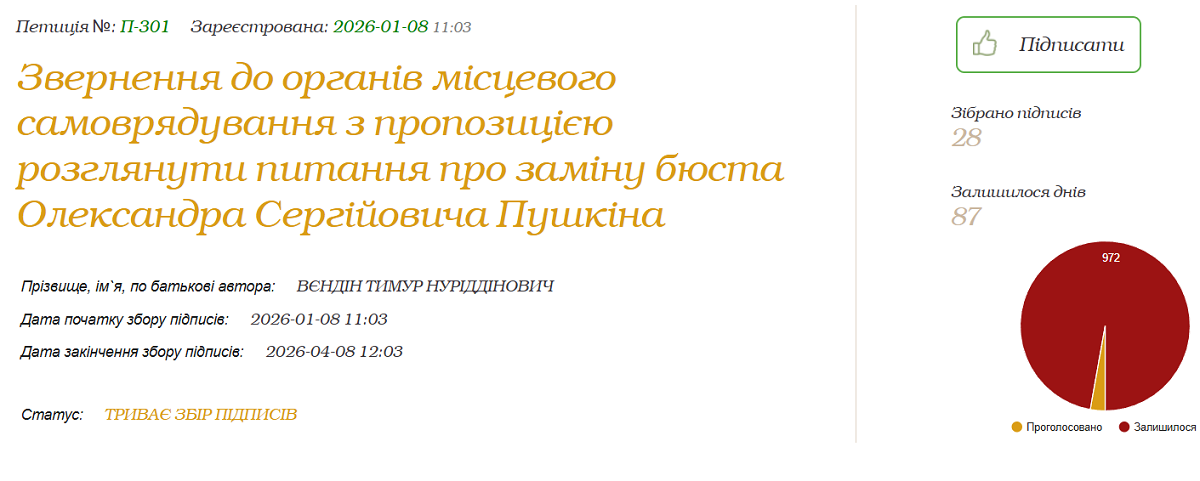 З 8 січня петицію підписали 28 людей. Для розгляду потрібна тисяча.