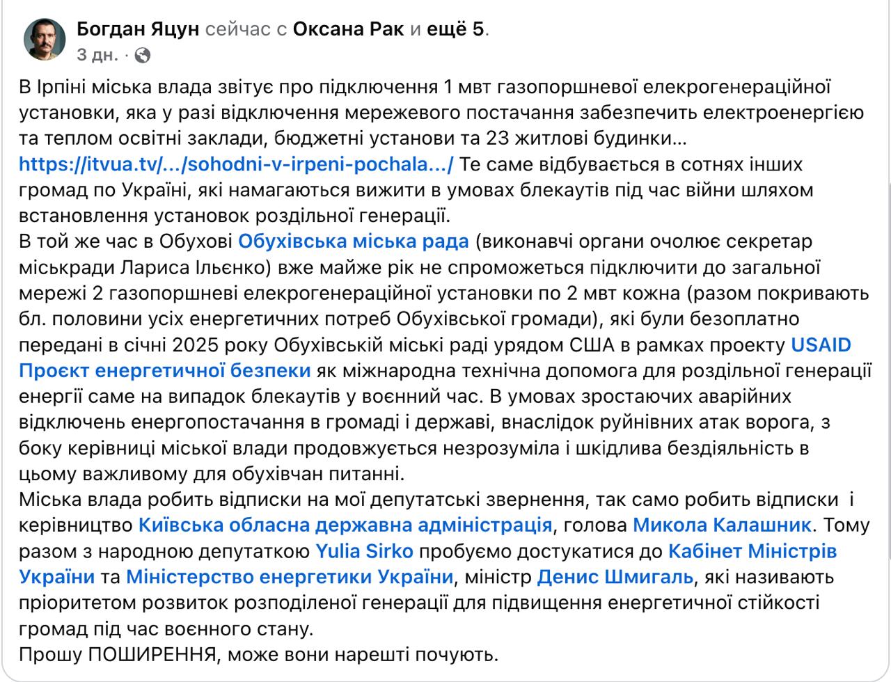 "Проектно-кошторисна документація знаходиться на погодженні в ДТЕК, що призвело до відстрочення робіт з підключення установок. І хоча законодавством України передбачено спрощений порядок підключення такого енергетичного обладнання під час військового стану, схоже, міська влада Обухова не планує проводити ці роботи за спрощеним порядком", - заявив депутат.