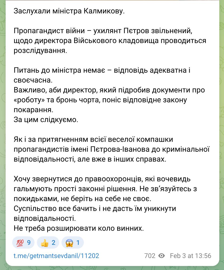 "Питань до міністра немає - відповідь адекватна і своєчасна. Важливо, щоб директор, який підробив документи про "роботу" та бронювання чорта, поніс відповідне закону покарання. За цим слідкуємо. Як і за залученням усієї веселої компашки пропагандистів імені Петрова-Іванова (Сергій Іванов - ведучий на Ютуб-каналі "Ісландія" - Ред. ) до кримінальної відповідальності, але вже в інших справах. Хочу звернутися до правоохоронців, які, мабуть, гальмують прості законні рішення. Чи не зв'язуйтеся з покидьками, не беріть на себе не своє. Суспільство все бачить і не дозволить їм уникнути відповідальності. Не треба розширювати коло винних", - написав Гетьманцев.