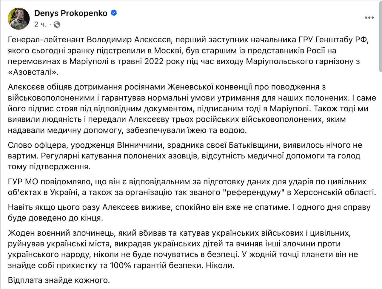 Командир "Азова" Денис Прокопенко (Редіс) дає зрозуміти, що замах на генерал-лейтенанта Міністерства оборони РФ, першого заступника начальника Головного розвідувального управління (ГРУ) Генерального штабу російських Збройних сил Володимира Алексєєва було здійснено Україною.