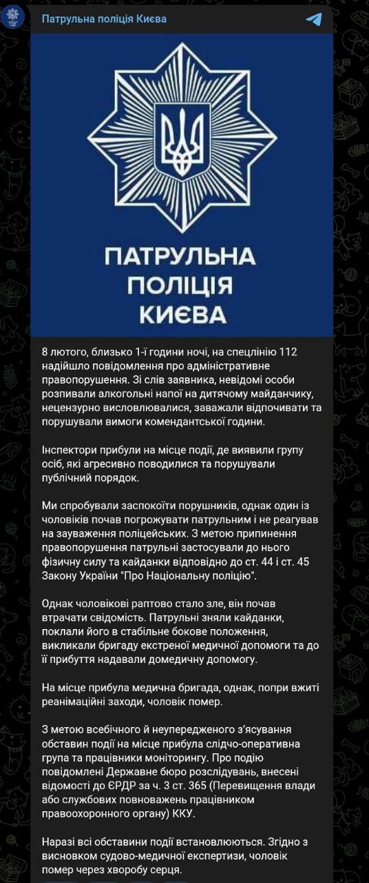 Державне бюро розслідувань, у свою чергу, вже відкрило кримінальну справу за фактом загибелі чоловіка, повідомляє патрульна поліція.