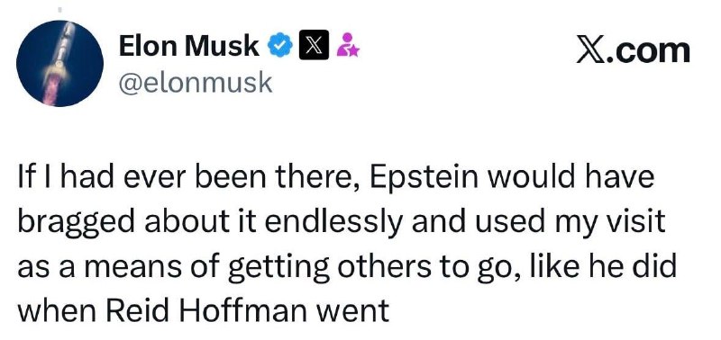 "Якби я коли-небудь там був, Епштейн цим нескінченно вихвалявся б і використав мій візит як спосіб спонукати інших приїжджати, як він зробив, коли туди приїхав Рід Хоффман (співзасновник сервісу LinkedIn - Ред. )", - заявив Маск.